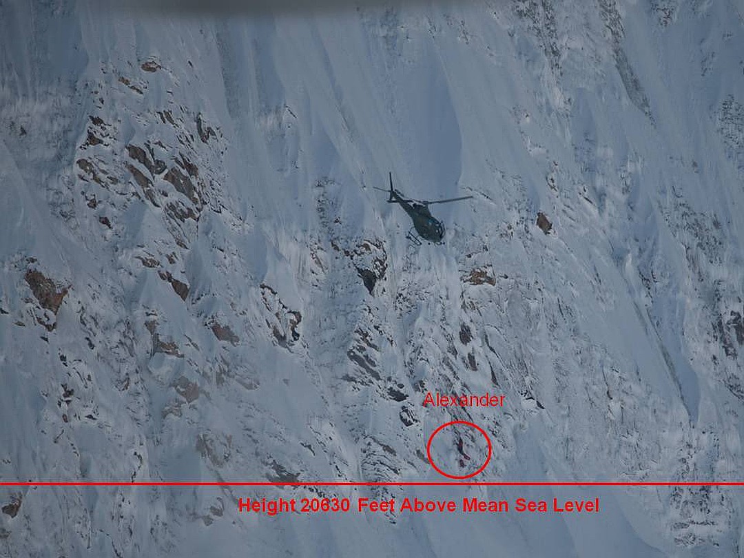 Утром 31 июля во время очередного облета спасатели заметили Александра на склоне. Его палатка оказалась почти полностью засыпана снегом. У вертолетов оставалось немного топлива, но они решили попробовать поднять Александра.