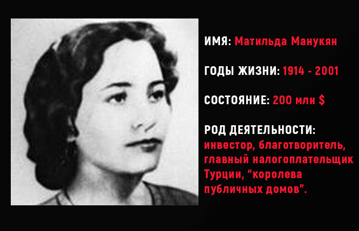 В октябре 1992 года эта женщина возглавила рейтинг самых богатых женщин Турции и мира по версии авторитетного журнала «Нокта». Её состояние оценили в 200 миллионов долларов. Официальные источники говорили о ней, как об успешном инвесторе в недвижимость, как о главном налогоплательщике Турции 1990-х годов и как о щедрой благотворительнице. О том, что Матильда Манукян, одна из влиятельнейших женщин-бизнесменов XX века, ещё и «королева публичных домов» знали все, но предпочитали умалчивать.