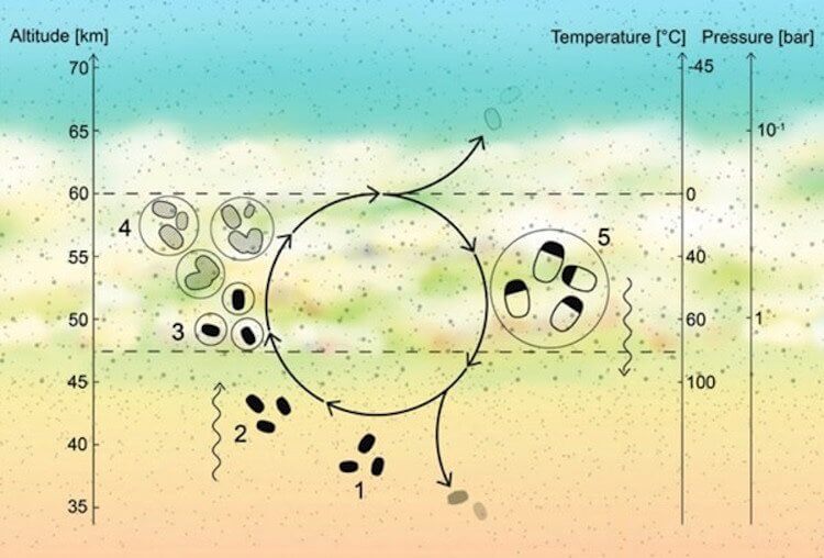 Предлагаемый жизненный цикл микробов, выживших в кислотных облаках Венеры, показан на этой иллюстрации. (1) Обезвоженные микробы выживают в вегетативном состоянии в нижнем слое дымки Венеры. (2) Споры поднимаются восходящим потоком в нижний облачный слой. (3) После контакта с жидкостью споры становятся метаболически активными. (4) Эти микробы делятся, и капли растут. (5) Капли вырастают достаточно большими, чтобы опуститься вниз, где они начинают испаряться из-за более высоких температур, побуждая микробы трансформироваться в споры, которые остаются в нижнем слое дымки.