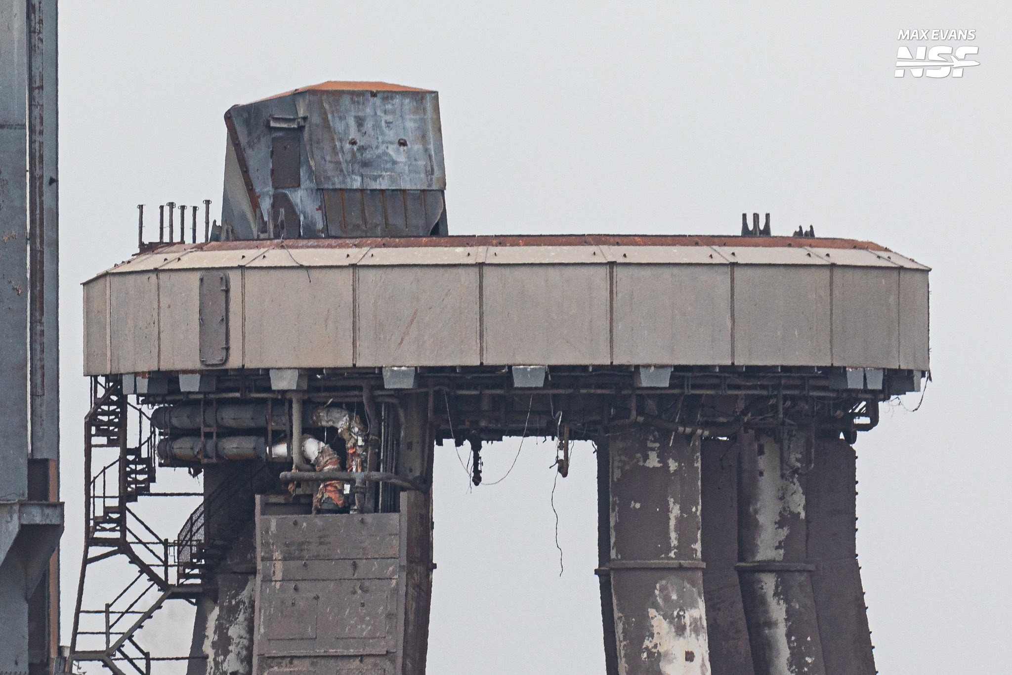 — Из хорошего: «Бублик» стартового стола, визуально, выглядит — хорошо. Несмотря на всевозможные слухи, повреждений на нём не наблюдается. Сталь пережила взлёт Starship, в отличие от бетона. Башня обслуживания также выглядит хорошо (хотя и ей досталось от двигателей ускорителя и разлетающихся бетонных «снарядов»). Руки Мехазиллы на своём месте, без перекосов.