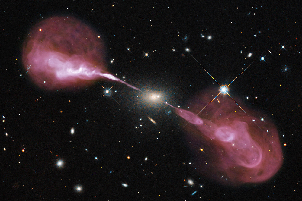 Геркулес А — еще одна огромная радиогалактика, которая внешне, в оптическом диапазоне, выглядит не особенно примечательно. Однако это один из самых мощных радиоисточников в космосе. Черная дыра массой более 4 миллиардов солнечных выбрасывает радиоджеты общей длиной в 1,5 миллионов световых лет. В радиооблаках, которые вылетают из центра галактики, наблюдаются очень четкие «слои», а это значит, что Геркулес А примечателен еще и тем, что струи выходят не постоянно, а как бы пульсируя.
