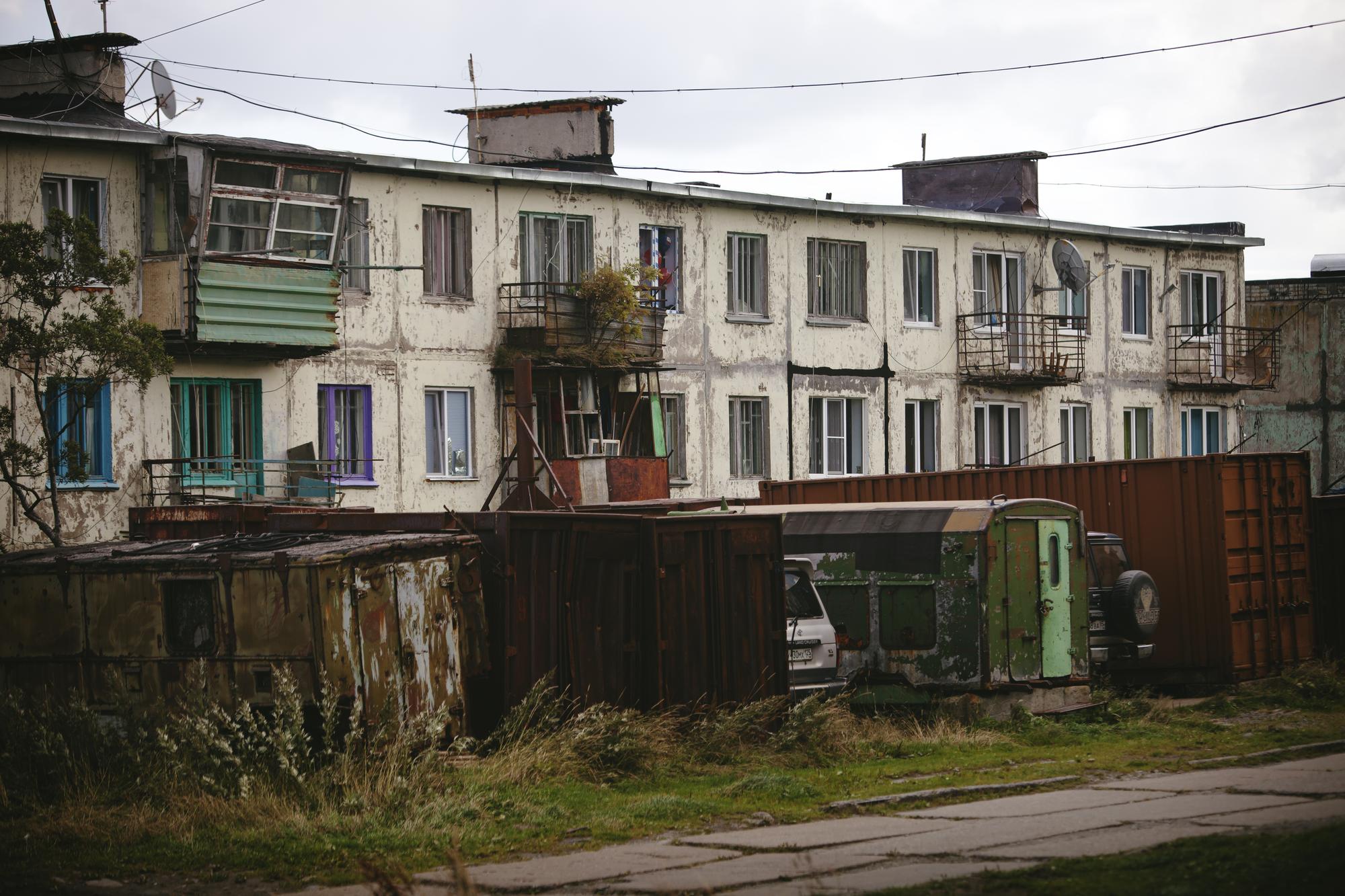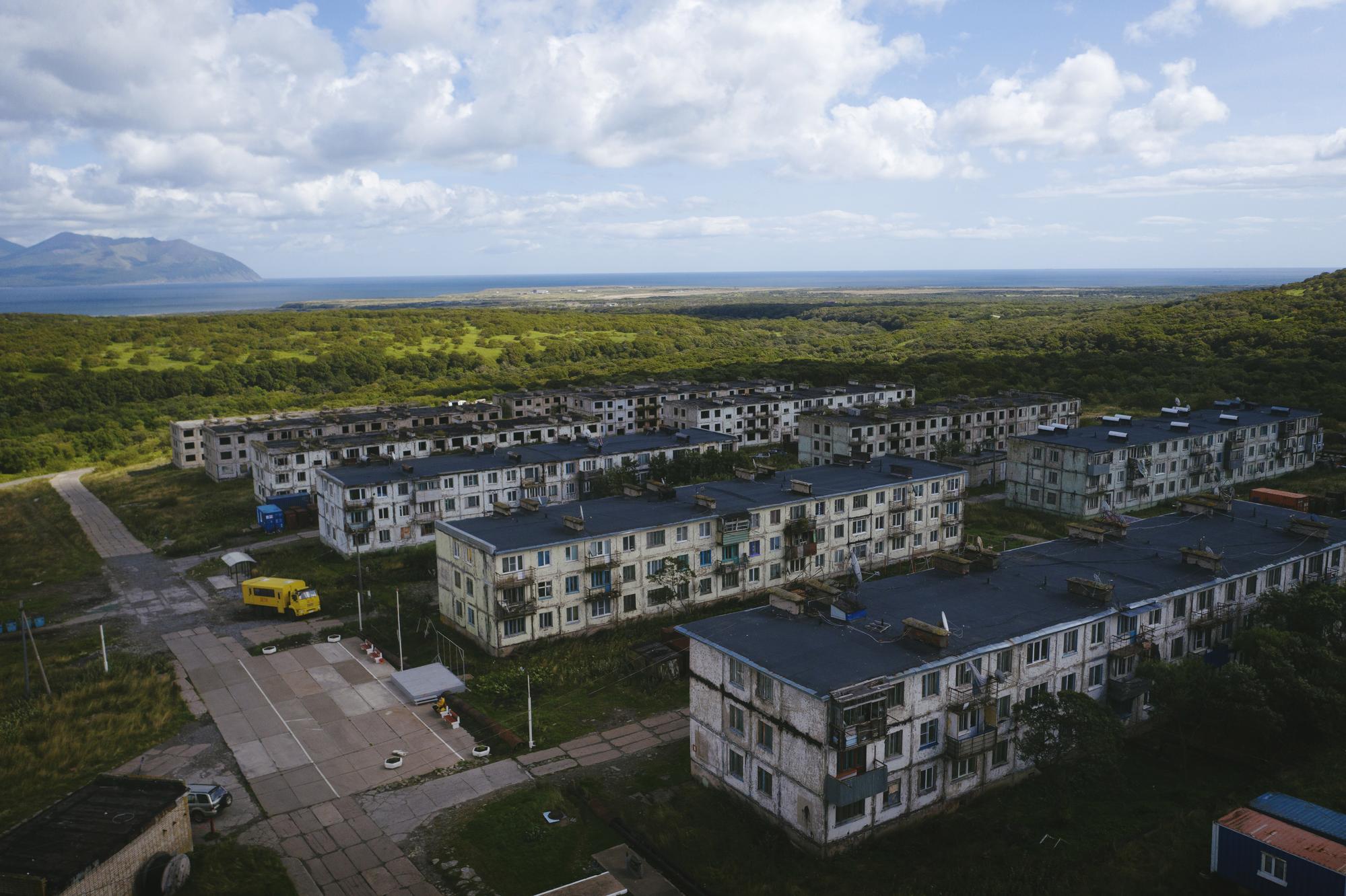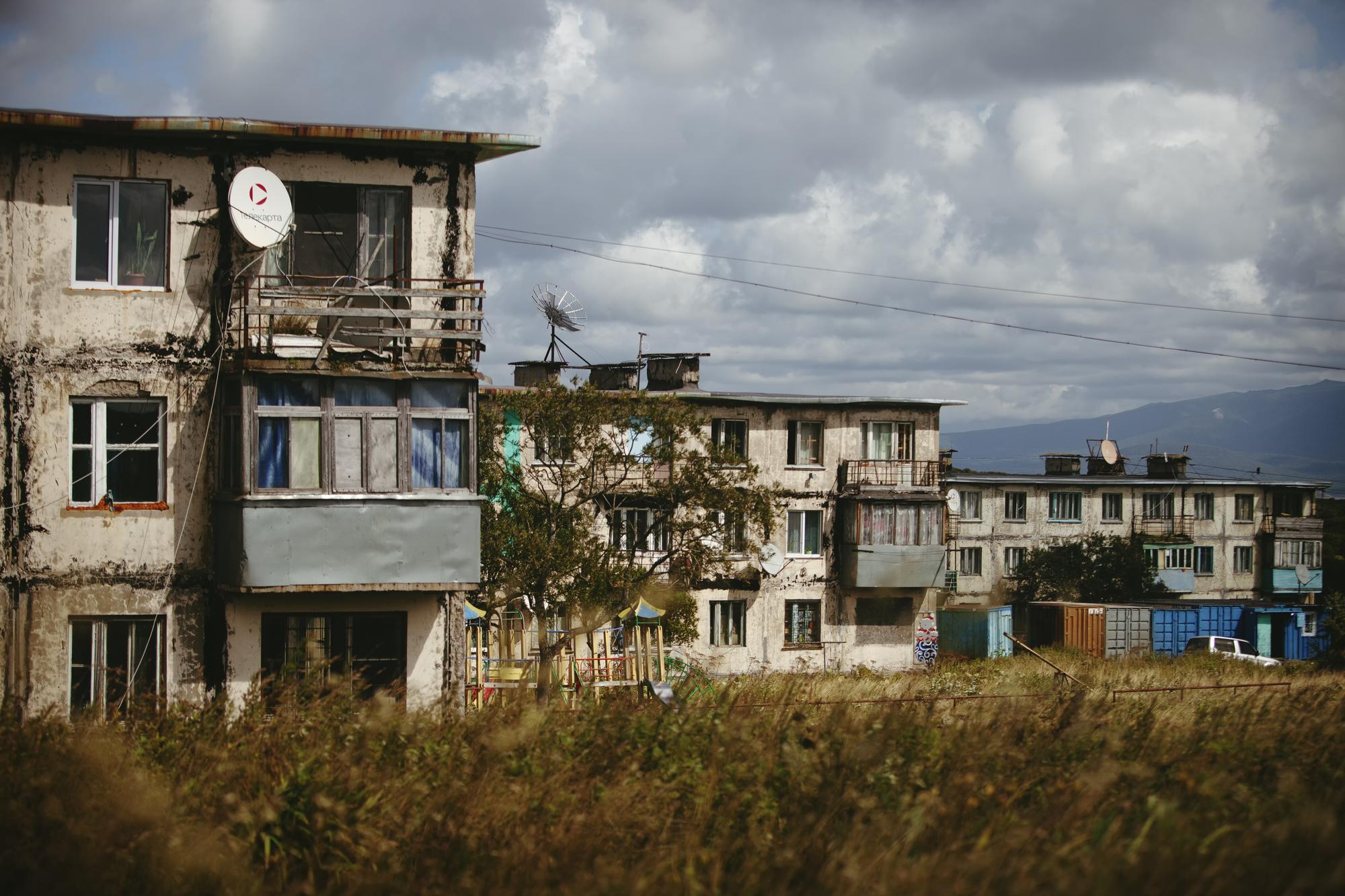 Горное, расположенное в 55 километрах от райцентра, города Курильск, резко контрастирует с остальными благоустроенными населенными пунктами Итурупа. Вместо новых домов, больниц и дорог — полуразрушенные здания с выбитыми окнами, неухоженные придомовые территории и горы строительного мусора.