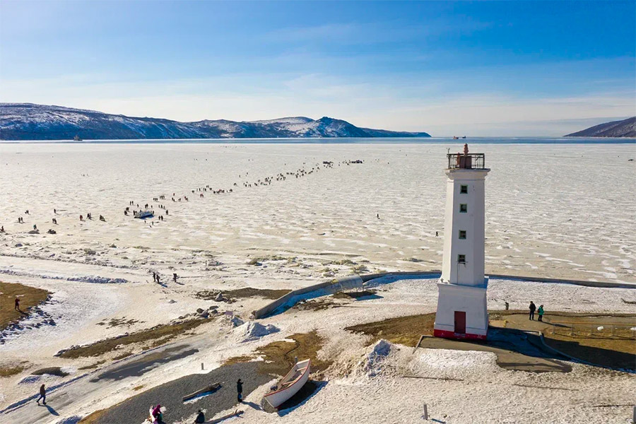 Она находится на побережье Охотского моря и покрывается толстым слоем льда. Можно сделать фото, как на Байкале, то есть лёжа на синем льду на фоне красивого горного хребта. Конечная точка маршрута — посёлок Талон. А хотите, двигайтесь дальше на запад, до базы отдыха «Кавинская долина». Основные развлечения там: рыбалка, баня и трекинг по живописным сопкам, но уже в отдалении от моря.