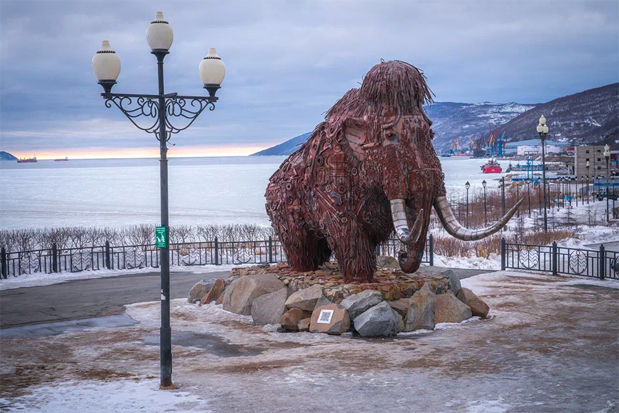 Чуть в стороне от «Маяка», в живописном местечке на берегу бухты Нагаева стоит мамонт из железа: шестерёнки, гайки, винтики, пластины сливаются воедино и образуют пятиметровую скульптуру весом в шесть тонн. Скульптурная композиция называется «Время». Местный скульптор Юрий Руденко как-то гулял по заброшенному прииску и увидел кости мамонта, лежащие вперемешку с металлоломом. Так ему в голову пришла идея создать масштабный арт-объект. Работа заняла четыре года. Любопытный факт: в ветреную погоду мамонт начинает «рычать» — так воздушные потоки играют между его деталями.