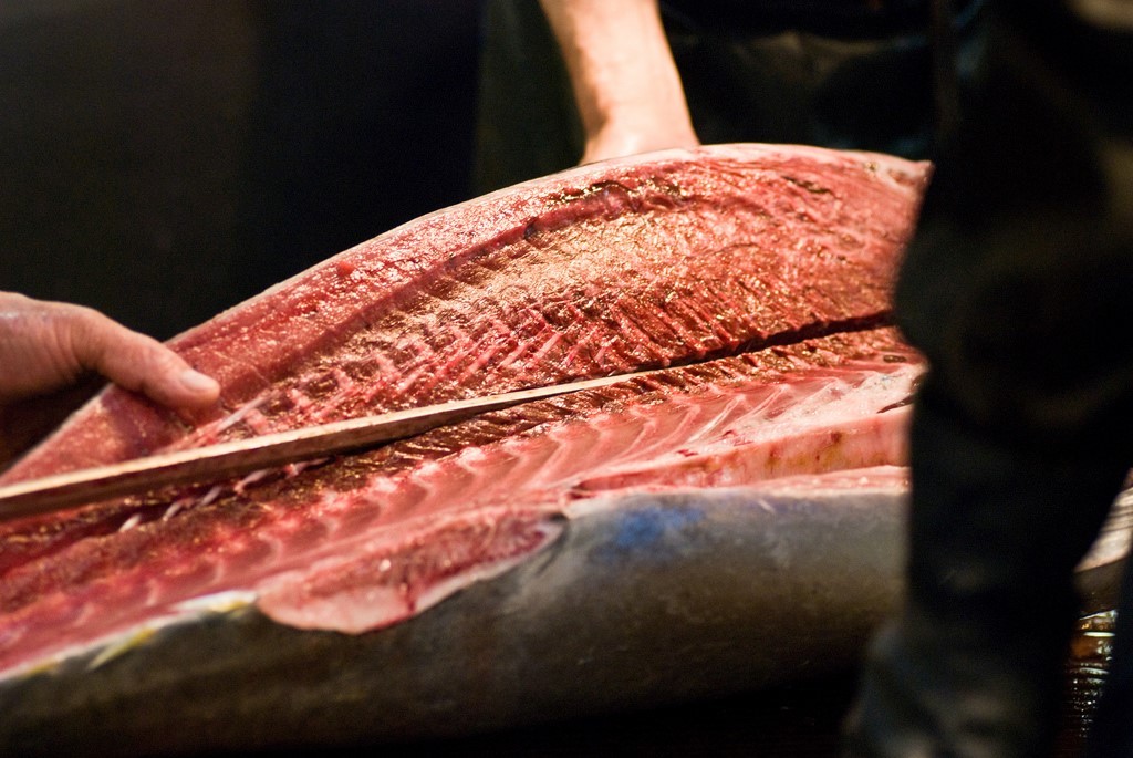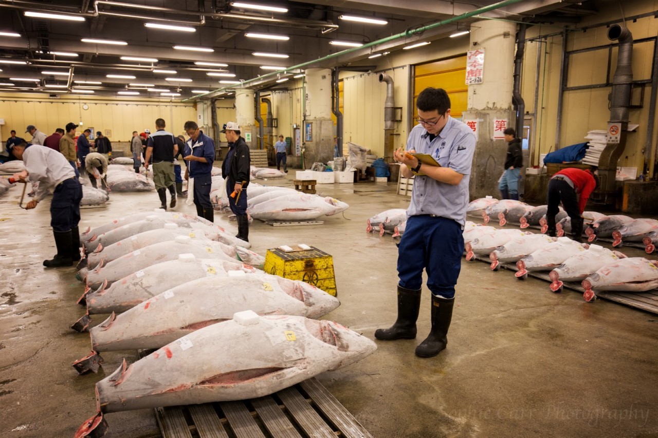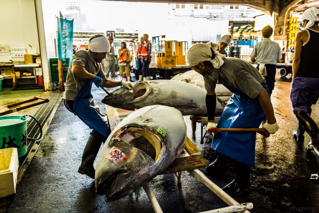 Ключевая фигура торгового процесса — это тунец, рыба дорогостоящая, обладающая массой полезных пищевых свойств. Тысячи гигантских туш тунца поступают на рыбный рынок Цукидзи каждый день, где ждут своего часа, а именно начала аукциона. Продавцы готовятся к этому действу, подробно изучая качество сырья, а для выделения лучшего товара все тушки нумеруются. С этой целью каждую тушку осматривают со всех сторон, поднимая и перетаскивая с помощью специальных больших крюков. Истинные знатоки способны обнаружить едва уловимые различия по качеству, проведя рукой по поверхности туши и оценив её гладкость и упругость. Лучшими признаются самые мясистые, плотные туши.