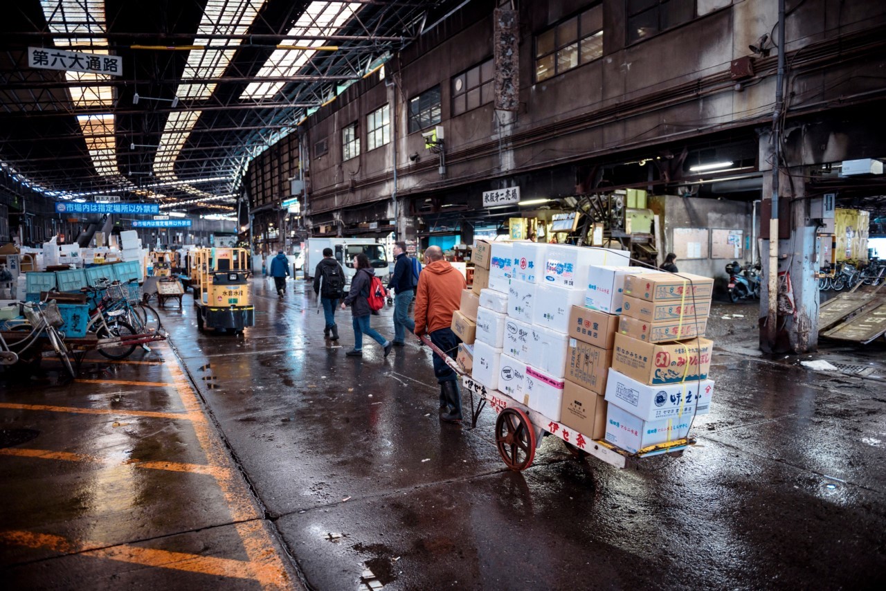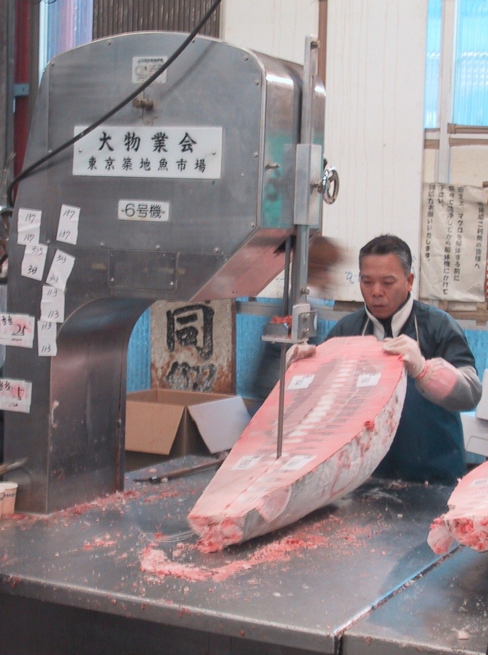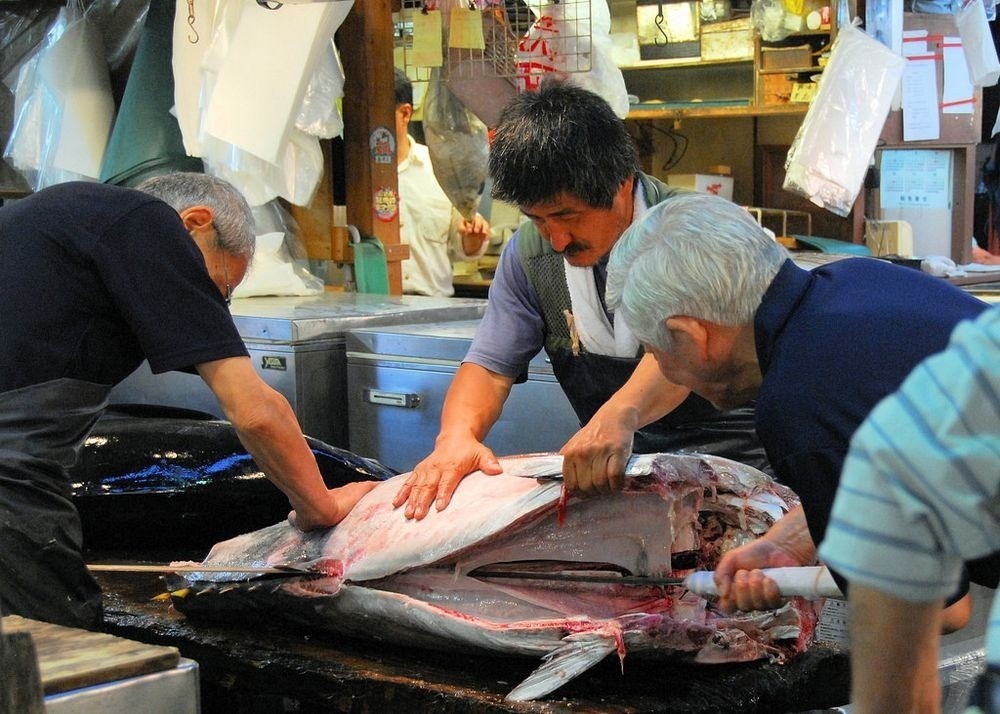По окончанию очередных торгов замороженные туши тунца грузят на поддоны, отмывают, распиливают на бруски, погружают в электрокары и отправляют на отгрузку. К тому времени, когда офисы японской столицы только-только начинают новый трудовой день, рынок Цукидзи в Токио уже завершает свою работу: последние партии обработанной рыбы погружаются в холодильные контейнеры из пенополистирола и поставляются до дверей клиента.