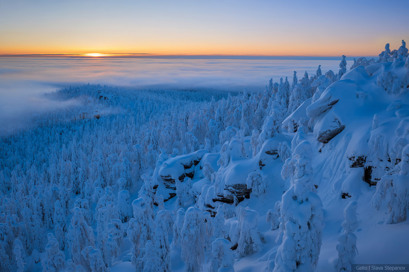 9. Зимний рассвет над Полюд — тайга скрыта под облачным морем, а вершина остаётся островом снега и камня.