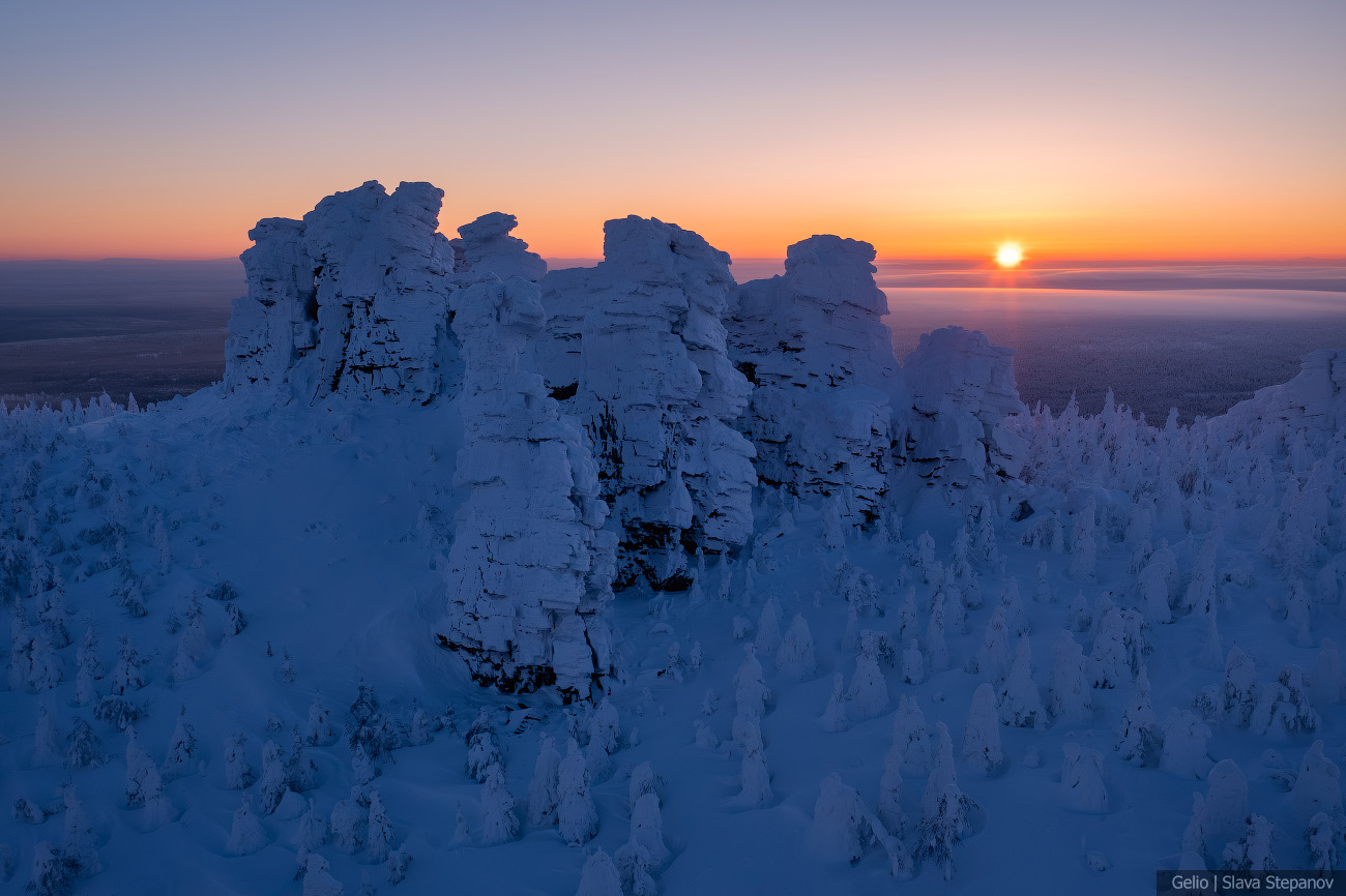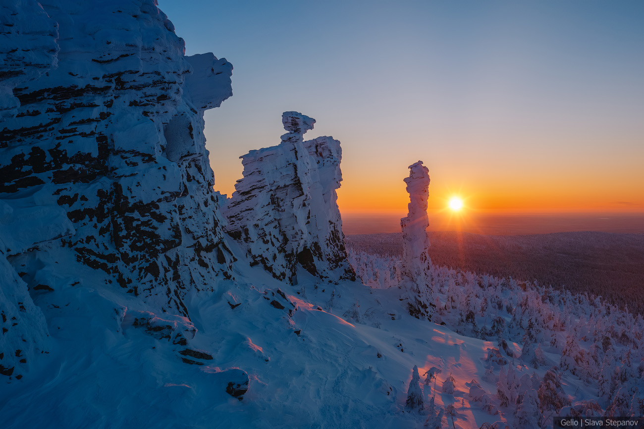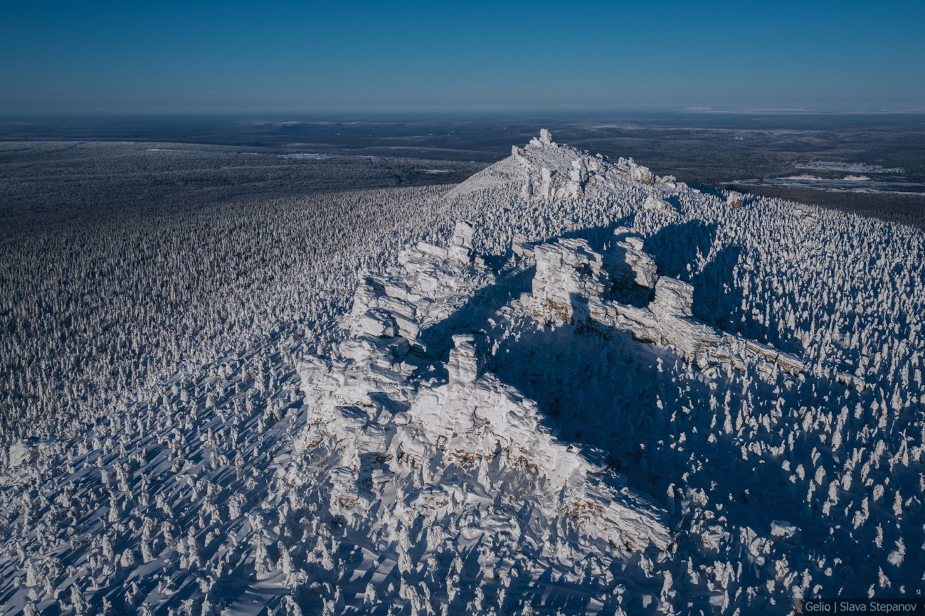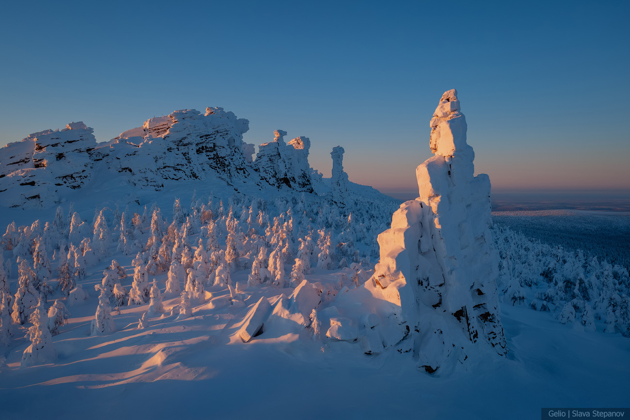 35. С вершин открывается вид на Полюд, окружающие хребты гор и бескрайние леса, покрытые снегом — территория древней Пармы во всей красе.