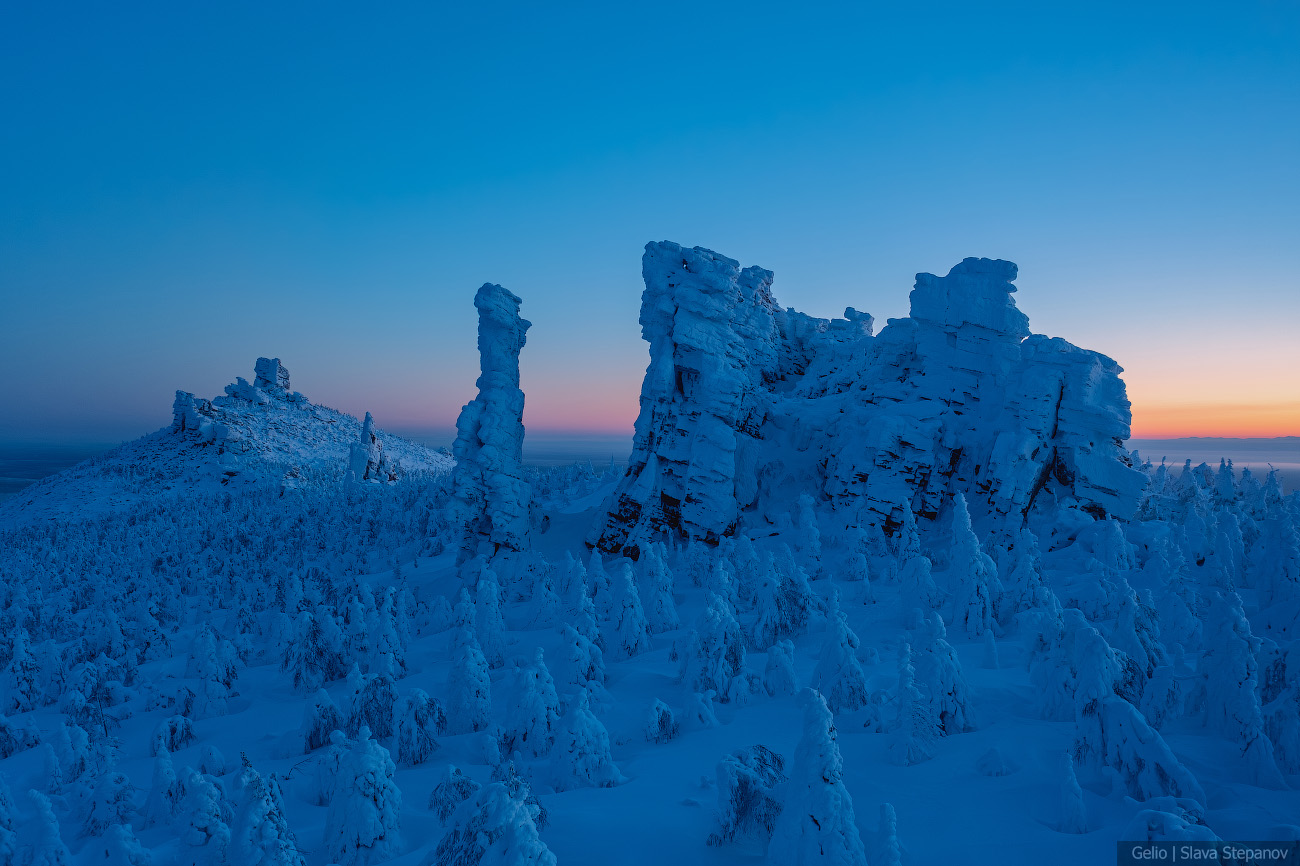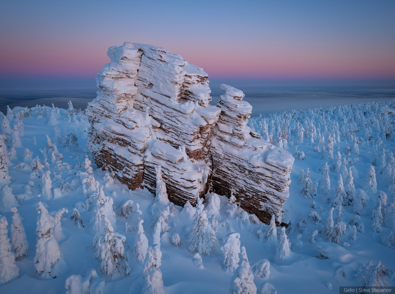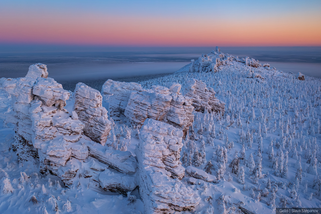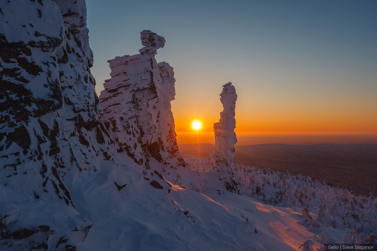 35. С вершин открывается вид на Полюд, окружающие хребты гор и бескрайние леса, покрытые снегом — территория древней Пармы во всей красе.