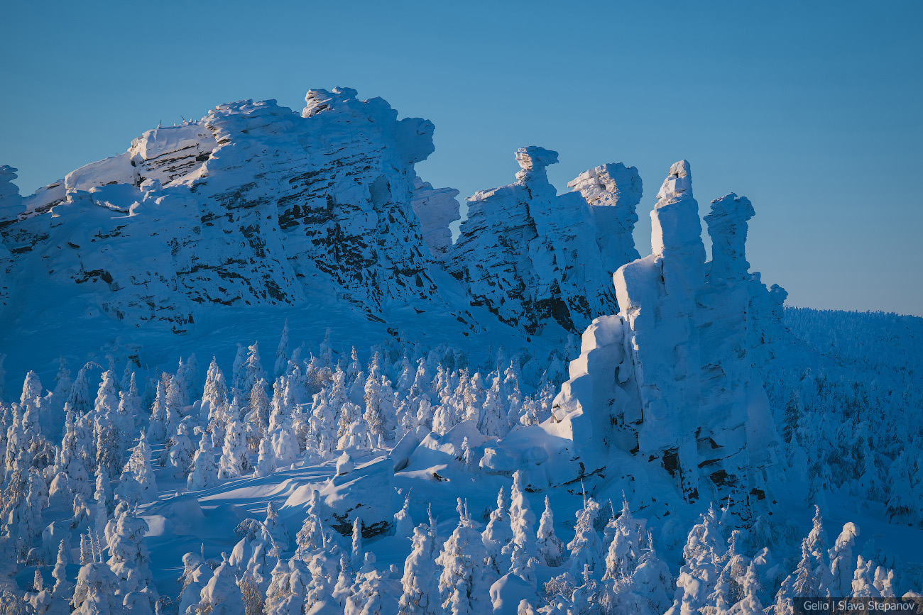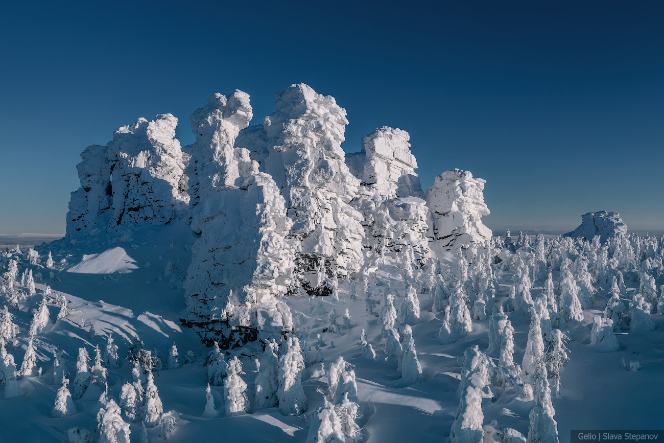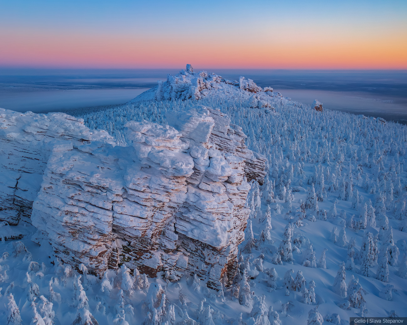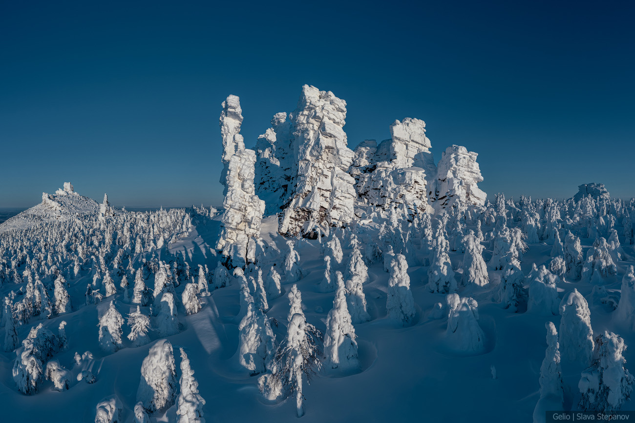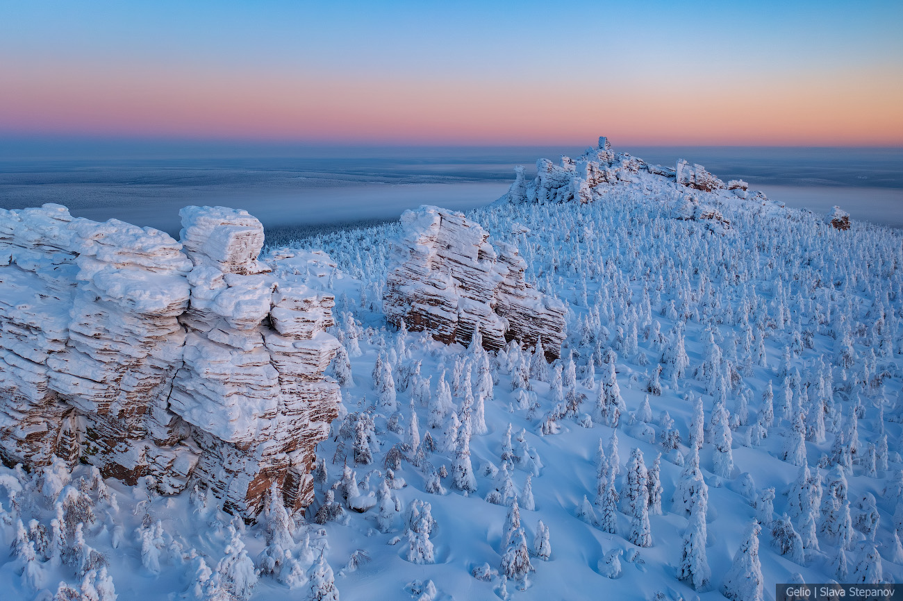 35. С вершин открывается вид на Полюд, окружающие хребты гор и бескрайние леса, покрытые снегом — территория древней Пармы во всей красе.