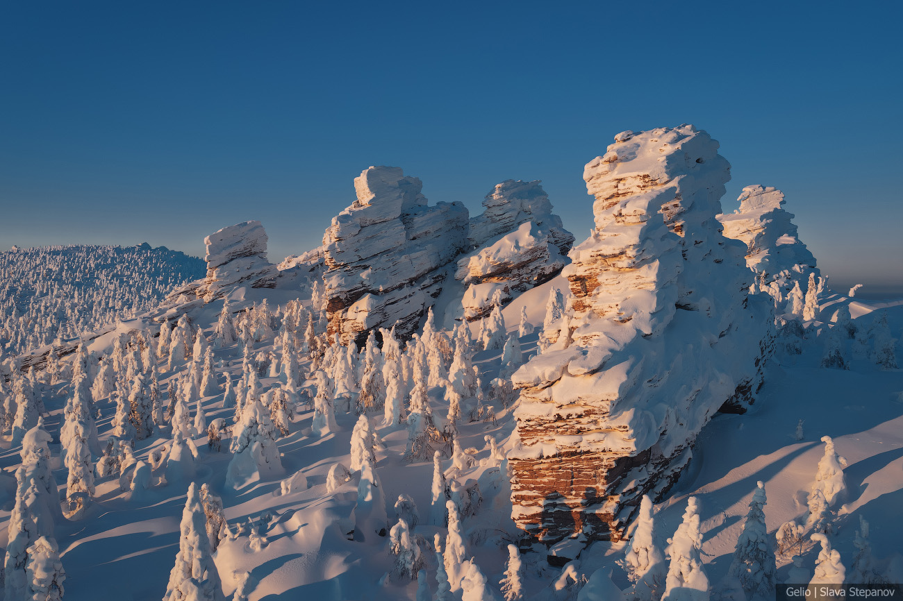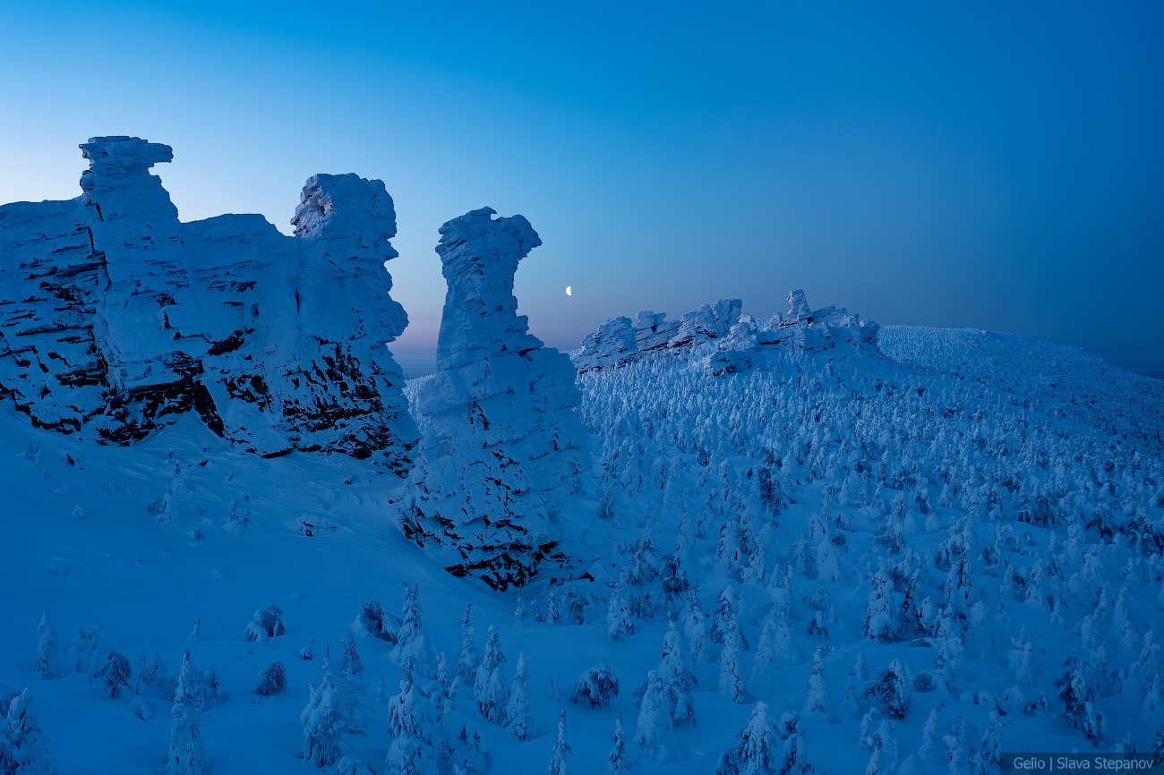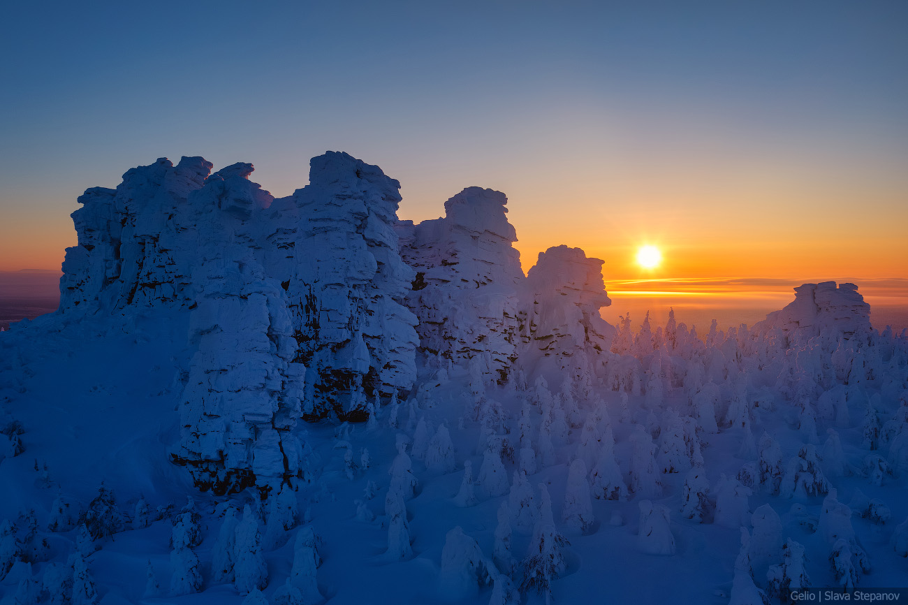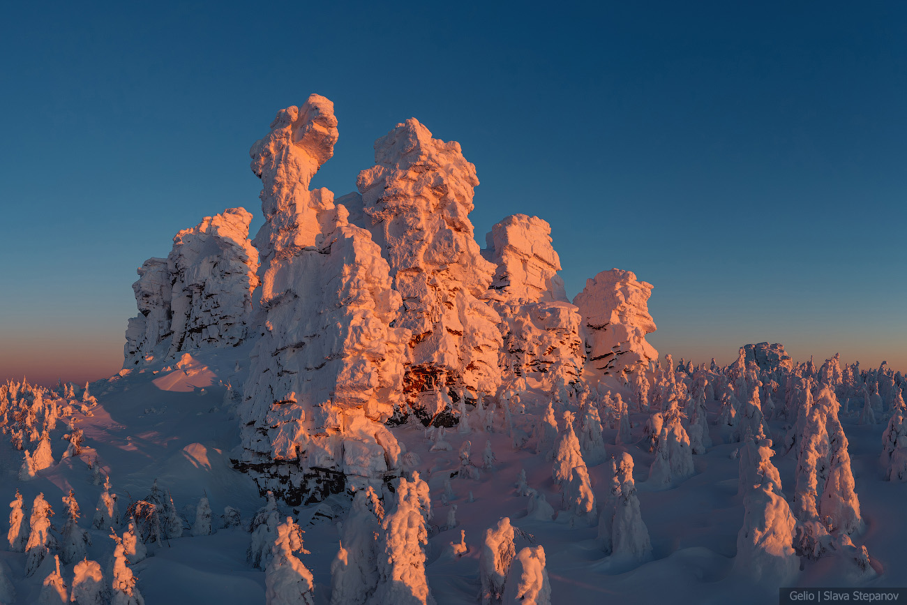 35. С вершин открывается вид на Полюд, окружающие хребты гор и бескрайние леса, покрытые снегом — территория древней Пармы во всей красе.