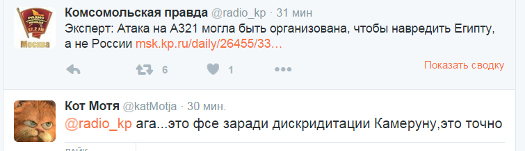 — Да, я не сомневаюсь, что это теракт, большой и очень кровавый намек России. Попытка ухудшить наши отношения с Египтом, с которым у нас опять начался «медовый месяц» в отношениях. Единственное положительное в этой трагедии, простите за цинизм, — начался вывоз наших безумных и уставших граждан из зоны боевых действий, которая по недоразумению и лукавству считается туристической. России совершенно не нужно держать 80 тысяч потенциальных заложников в стране, где несколько лет у власти были исламские экстремисты. И после переворота они никуда не делись — их в Египте миллионы.