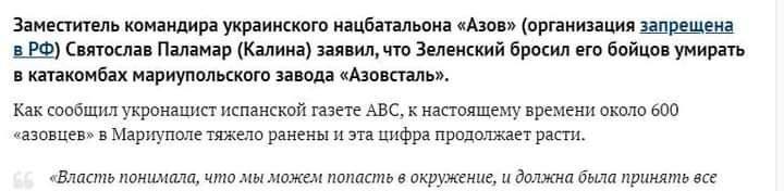 Для Зеленско Азов нужен мёртвый и забытый. Антифашисты отнеслись к азовцам лучше, чем собственное руководство. Поэтому Кокаиниссимус и молчит, он не ожидал сдачи гарнизона Мариуполя, надеялся на их гибель. Но трагедии не случилось, ненависть разогнать не получилось, теперь крепко думают, как замять скандал. Видимо решили игнорировать любую информацию о Мариупольской группировке. А впереди новые котлы и новые скандалы