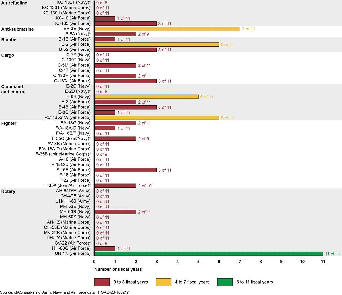 В 2021 году только 2 из 49 авиационных флотов достигли целей по ремонту и модернизации — на это дело из бюджета было выделено 54 млрд долларов, что на 3 млрд меньше, чем годом ранее — при этом только текущее техобслуживание подросло на 1,2 млрд, не включая растущую стоимость запчастей.