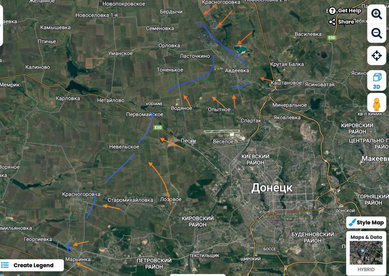 Далее рубеж Марьинка-Красногоровка-Авдеевка. Здесь всю неделю наши войска беспрерывно идут вперед, отгрызая один опорник врага за другим. Практически закончена зачистка Марьинки, не считая районов за ставками (улица Ивана Франко). В целом здесь надо обратить внимание на то, что на Донецком направлении постепенно начинают активизироваться боевые действия на участках, которые считались достаточно спокойные. Это прежде всего район Красногоровки и Первомайского (см. Карту 4).