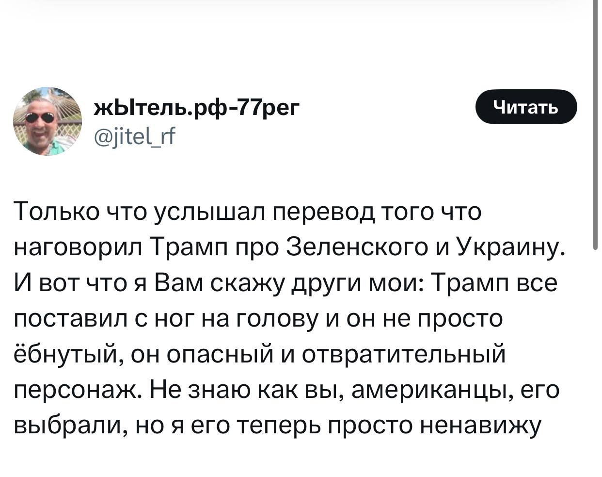 — У Трампа есть конкретный план по прекращению войны: «Надеюсь, это будет быстро. Каждый день гибнут люди. Эта война так ужасна для Украины. Я хочу положить конец этой чёртовой штуке».