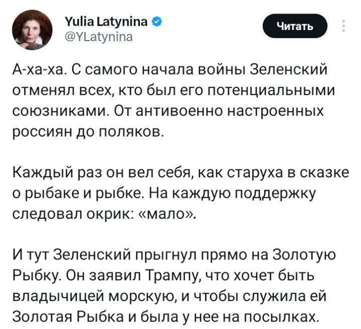 Формальный старт праздничному заезду «Кто быстрее достанет коротышку Зе» дал пост Дональда Трампа, где он прямо назвал Зеленского «диктатором с четырьмя процентами поддержки». Все инстинктивно почувствовали, что для Зеленского это плохой знак, но поняли это по-своему. В частности, Bloomberg вчера написал, что «нападки Трампа на Зеленского оставляют Украину без хороших альтернатив»: «Любые остававшиеся надежды, кажется, угасли в среду, когда Трамп <...> назвал Зеленского диктатором». Европейские СМИ (преимущественно британские) сделали фальстарт и дружной толпой бросились критиковать Трампа и защищать Зеленского, не понимая, что Большой Дональд подал знак совершенно о другом.