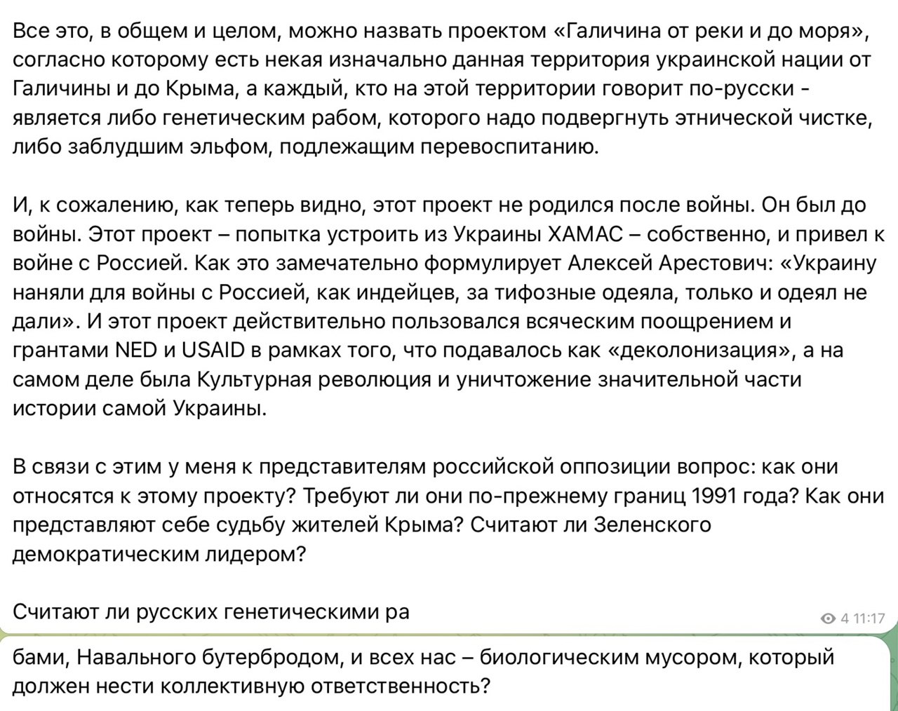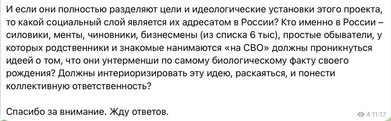 Какая прелесть! Ну если бы не обсуждать то, что написали военблогеры об СВО, то и не было бы львиной доли писанины в интернете:))) А так — резюме на мнение блогера такого-то получите, а затем мнение на резюме, обобщение и систематизация мнений, обличение систематизированного, контробличение обличителя и пошло, поехало...:))) Все довольны, все сражаются «за наших»:)))
