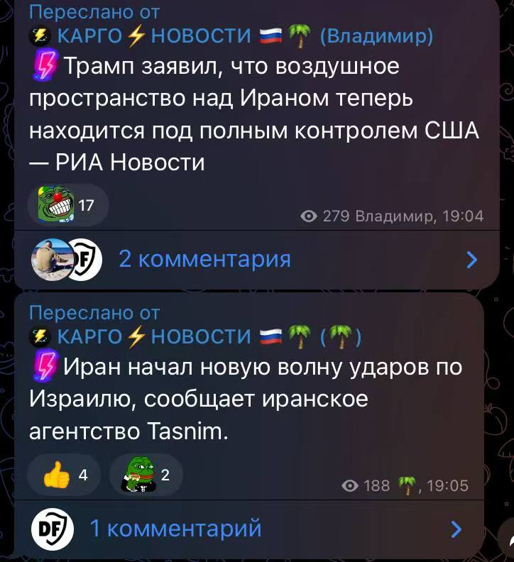 ▪️Атаки США на иранский ядерный объект в Фордо были поверхностными, утверждает Fars. Он серьезно не поврежден, данных о радиации нет. Также сведений об увеличении уровня радиации за пределами ядерных объектов в Иране не получило и МАГАТЭ.