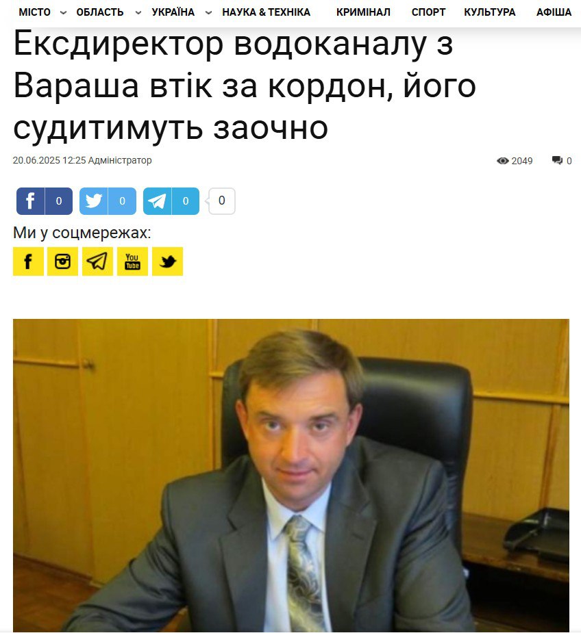 Рубрика «Сбежал из Украины» за 20.06.2025… Из Украины сбежал экс-директор водоканала г.Вараш, Игорь Семенюк, прихватит в карман 800 тысяч гривен бюджетных денег...