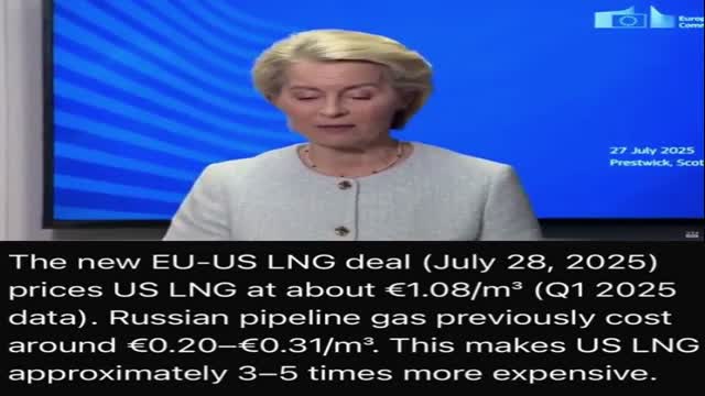 На момент заключения новой энергосделки между США и ЕС (28 июля 2025) цена американского сжиженного газа составляет примерно 1.08 евро за кубометр (данные за 1-й квартал 2025). А цена российского трубопроводного газа была на уровен 0.20-0.31 евроцентов за кубометр. То есть американское топливо приблизительно в 3-5 раз дороже.