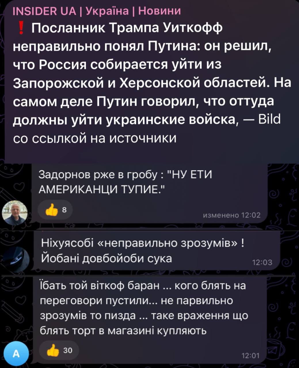 «Ситуация на фронте, особенно на востоке, остаётся сложной. Украина там теряет территории, однако российская армия в последние недели понесла серьёзные потери. Военное захват этих территорий, о которых идёт речь, был бы для России крайне трудным и мог бы занять ещё годы. Но люди в Украине устали от войны, опросы показывают, что до 75% теперь выступают за переговоры. Остаётся надежда, что в итоге европейские государства смогут донести до Трампа, что он не может продать Украину против её воли, и что люди не согласятся на любую сделку. Но ясно и другое: Трамп хочет наконец заключить сделку. Вопрос лишь в том, чего эта сделка может стоить Украине».