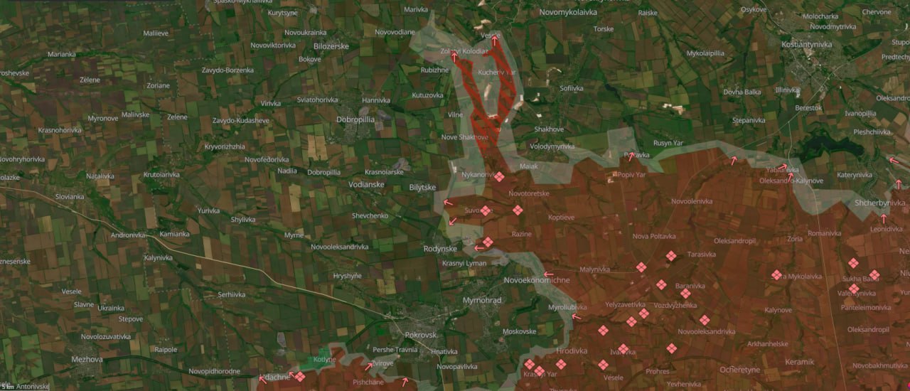 Переброска новых украинских частей под Покровск позволила боевикам усилить сопротивление около города. Первый удар врага пришёлся на зону прорыва. Три-четыре усиленных взвода ВС РФ у Кучерова Яра на протяжении нескольких суток продолжают удерживать позиции.