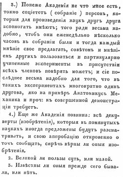 "… всё, что в науках уже учинено, разыскивать, что к исправлению и приращению оных потребно есть, производить, что каждый в таком случае изобрёл, сносить, и тое секретарю вручить, которой понуждён будет оное, когда надлежит, описывать."