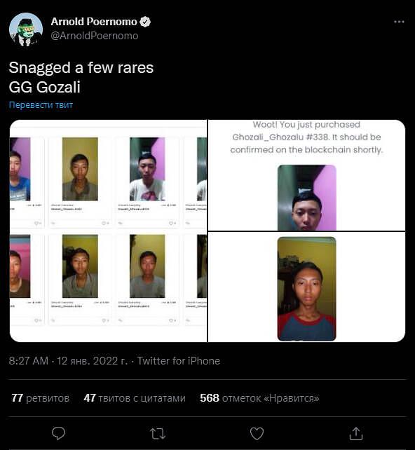 В начале 2022 года 22-летний студент из Индонезии Султан Густаф Аль Гозали попал на рынок NFT с необычным проектом — коллекцией из 933 однотипных селфи, которые он снимал на протяжении последних пяти лет, чтобы чтобы смонтировать видео на память к выпускному вечеру. Его проект неожиданно набрал популярность, и теперь коллекция оценивается более чем в миллион долларов.