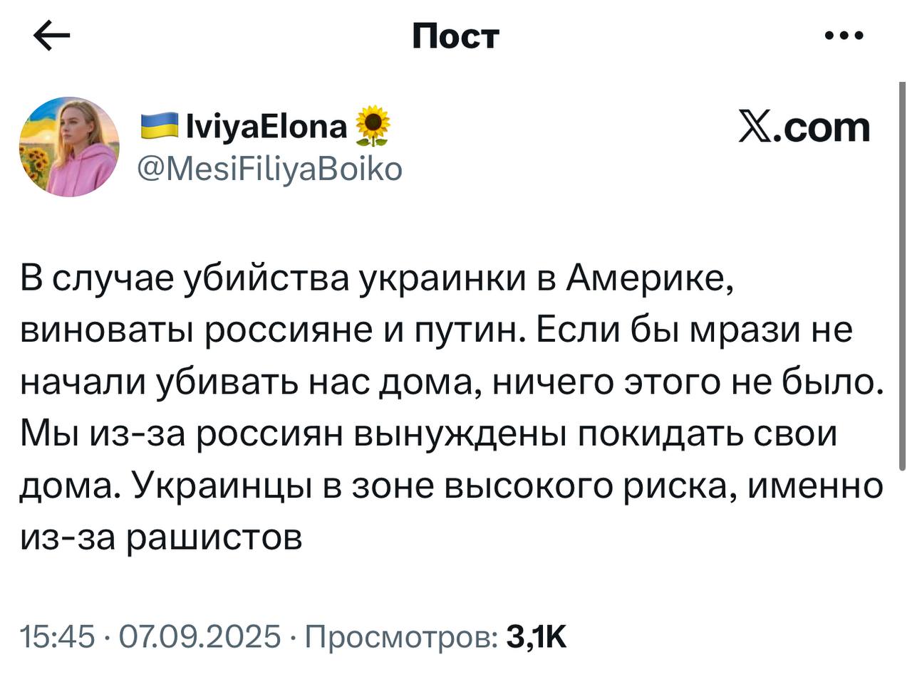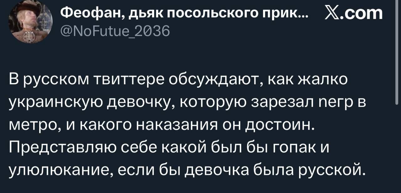 Уже даже Маск сообщает, что во всех американских СМИ НОЛЬ постов об убийстве украинки. Американский бомж просто так напал на нее в метро с ножом. Весь мир видел эти кадры. Но черных бомжей в Америке нельзя хейтить