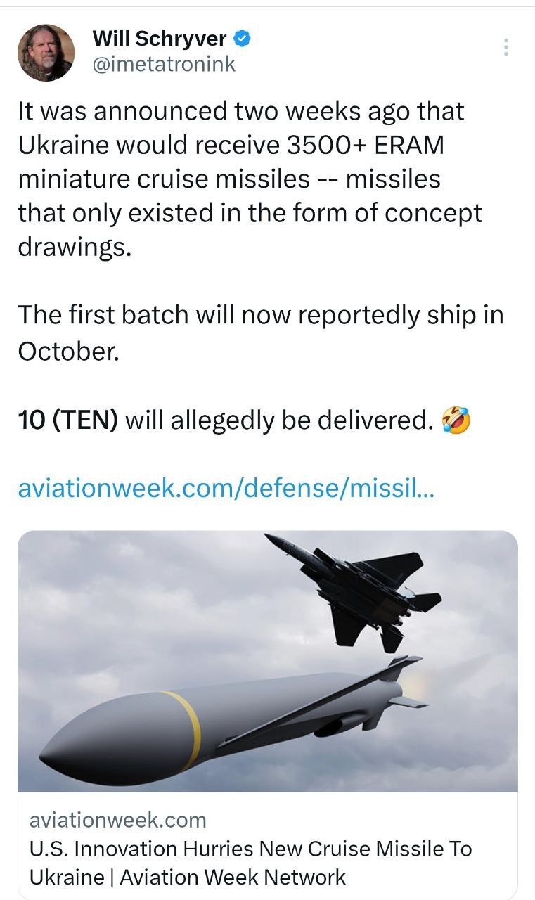 И вот, две недели спустя, торжественно объявлено о МЕГА ПОСТАВКЕ Киеву десяти (десяти) ракет ERAM. Ещё три-четыре сотни обещают изготовить к концу следующего года, но это не точно.