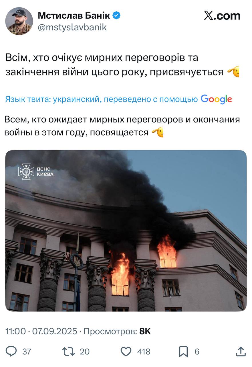 Впервые ВС РФ нанесли удар по Кабмину в Киеве «Искандером‑К» (боеголовка ≈450 кг) — боеголовка не взорвалась. Ранее сообщали, что 7 сентября ударили Геранью (источник — украинский канал Defense Express).