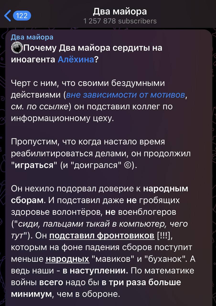 Военблогеры хотят продолжить торговлю паникой и монетизацию своих каналов, им прям ПЛОХО от «алехинского кейса», но, как и было предначертано, это только начало.