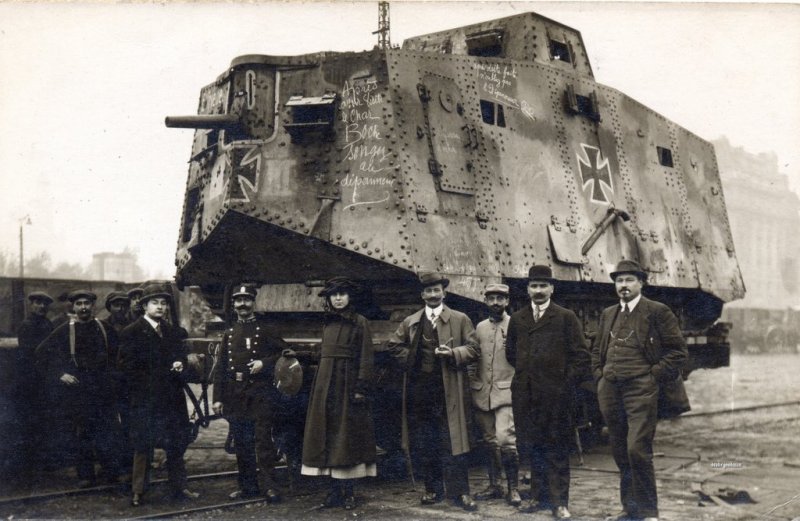 Германский танк Первой мировой войны A7V на ж/д-платформе